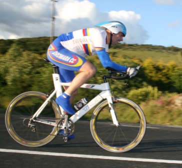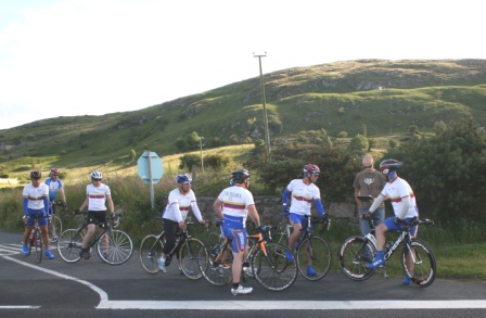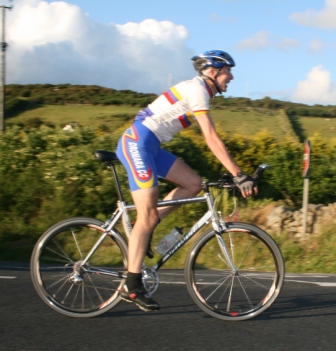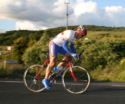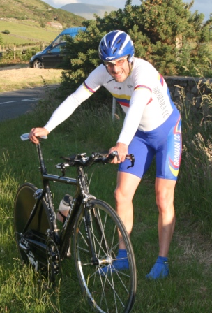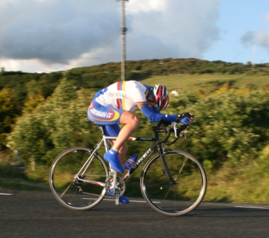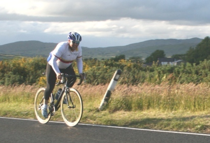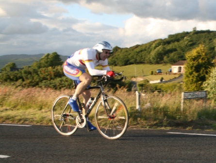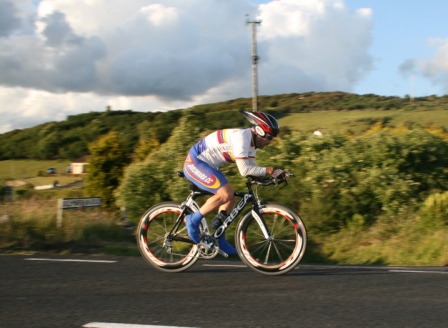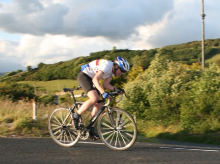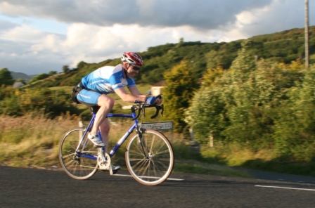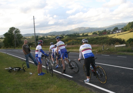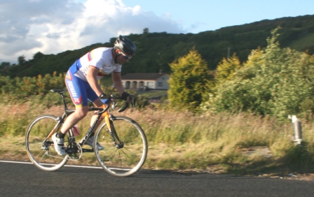 | 19 June 2008 Round 11 of Dromara CC's club league and tonight the riders had a choice of two distances, 16 mile or the more popular 25 mile starting at the Ballymagreehan Road junction 500 metres beyound the horseshoe bend on the Bann Road between Castlewellan and Banbridge (map). The 25 mile TT was for the Peter Jamison Cup which will be presented at the Christmas dinner/Awards night this year. The weather was fine, dry, warm but with a strong breeze, which was a vast improvement to the days earlier wet weather. The road surface was excellent with only the rolling hills to give the riders something to grumble about ! Looking at the riders tonight it was great to see Cyril having a go at his first time-trial and also great to see Deek continue his training this time on the tandem with his nephew 'stoking'. We even had spectators tonight with the well dressed John 'the welsh man' and the more casually dressed Maeve. They had something to cheer about when Davy McKnight finished the '25' just under the hour. Well done Davy. 25 mile time trial
