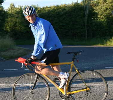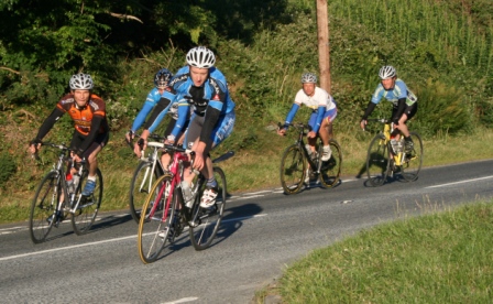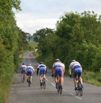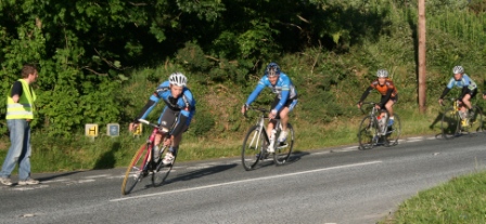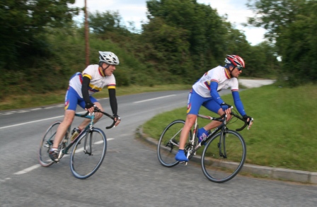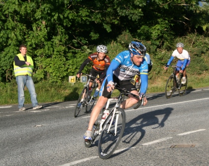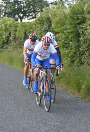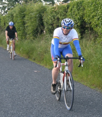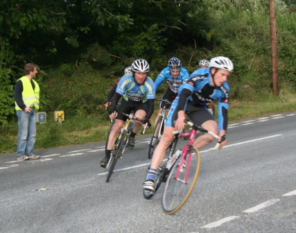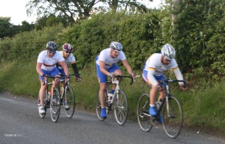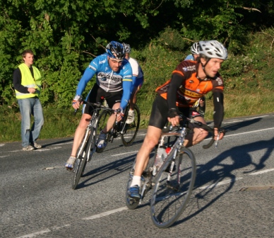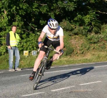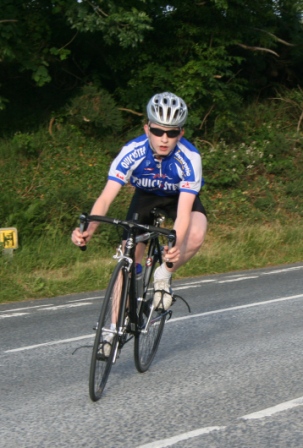 | 26 June 2008 Eighteen riders gathered for tonight's road race, the third of the season for Dromara Cycling Club and the twelve event in the club's 2008 calendar. The venue was the Drumaroad circuit (see map) and the weather was good, a little windy with nice bright sunshine to finish. The race was handicapped as before with riders placed into starting groups. Details of the time handicaps are given in the table below. Trevor and Stephen P sorted out the timekeeping effortlessly. Many thanks to them and all the marshalls. We had a few new faces at this event and fair play to the them for giving road racing a go. There was a slight mix up at the start when the scratch group allegedly followed Ronnie on the first lap, missed the first turn, took the next turn and effectively added 2 miles to their course! Two juniors joined us tonight (Ross and Ryan) for their first time racing and, chaperoned by Deek and Davy R, they seemed to have enjoyed their evening.