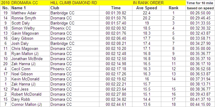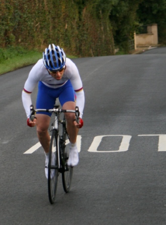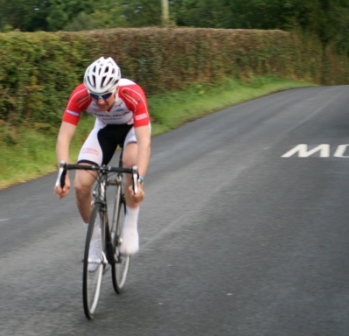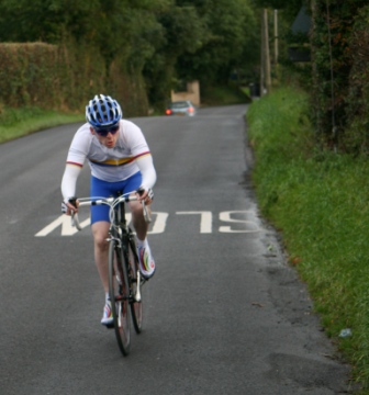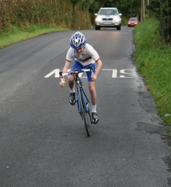 | Thursday 9 September 2010 Diamond Road, Dromore (map) On Thursday 9 September 2010, Dromara Cycling Club organised a hill climb event at the Diamond Road just outside Dromore. The climb was just 0.62 miles but the hill was steep, starting from the Gall Bog Road and climbing up the hill to the Orange Hall. Timekeepers were positioned at the top and bottom of the hill with syncronized watches. The 18 riders were set off at one minute intervals and arrived at the top of the hill looking exhausted. First away was youth rider Zak Hanna who set a time of 2 minutes and 22 seconds. He then stood and watched the other riders and their climbing technique. Having seen all the riders come up Zak went down the hill to try again. He managed to go almost 8 seconds faster and was much more pleased with his second run. Fastest on the night was visitor Matthew Adair (Banbridge CC) who set a great time of just under 1 minute 40 seconds. Second fastest was our own Ronnie Smyth in just over 1 minute 50 seconds. It was another visitor from the Banbridge club, Scott Daly, who was third fastest overall and the last of the riders who finished under 2 minutes with his time of 1m 57s. Winner of the 2010 club league was Simon Welby who set a time of just over 2 minutes. Simon was less than one second faster than Gavin Magowan who was runner up in the club league, fifth fastest on the night. A trophy has been put forward for this event by racing legend David McKnight for the fastest "non-open racer", this turned out to be Gary Gibson who was sixth overall with a time just under 2 minutes 7 seconds. Fastest junior was Ryan Mallon finishing his run in just under 2 minutes 13 seconds. Many thanks to the timekeepers Derek Hanna and Trevor Annett and to the marshals Stephen Wallace and Ivan Bradford. Resident film maker Nigel Sudlow took a video of the event (see below). Next week we have the final event of the road calendar with another short hill climb this time at the Begney Hill Road in Dromara. Start time 06:30 pm on Thursday 16 September 2010. The road racing season concludes with refreshments in Square One afterwards. Video from Nigel here |