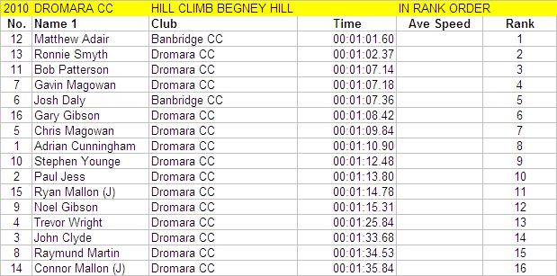 | Thursday 16 September 2010 Begney Hill Road, Dromara (map) For the final event of the Dromara Cycling Club Road League for 2010 there was a short hill climb up Begney Hill Road in the centre of the village of Dromara. Sixteen riders including two visitors took on this challenge before hanging up their 'good bikes' for the winter. It was a damp evening with a cold breeze. First rider away was Adrian Cunningham with the remaining riders starting at one minute intervals. Fastest on the night was visitor Matthew Adair (Banbridge CC) who set a great time of just over 1 minute. Second fastest and quickest Dromara rider was Ronnie Smyth, less than a second behind Matthew. It came down to a mere hundreths of seconds separating Bob Patterson, Gavin Magowan and visitor Josh Daly (Banbridge CC) who finished quickest in the order. Well done to all the riders. After the event the riders retired to the Square One pub for refreshments. Many thanks to the timekeepers Simon Welby and Trevor Annett and to the marshals Andrew Wilson, Anne Maguire, Brian McGrath. |