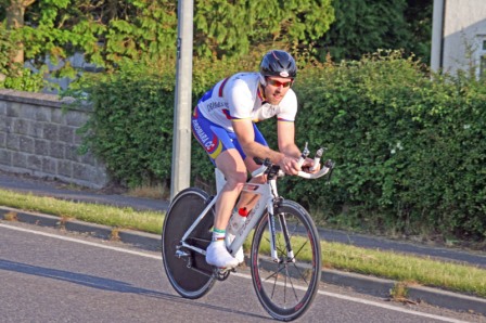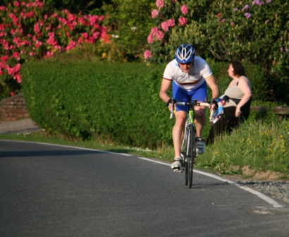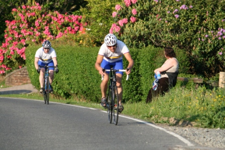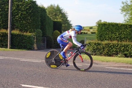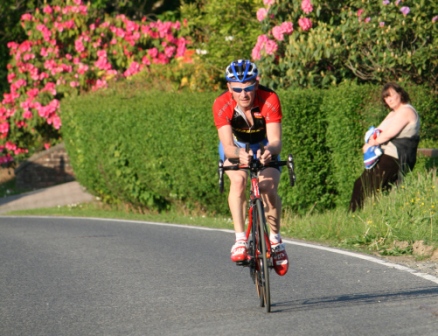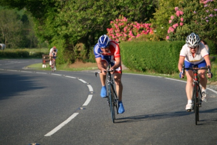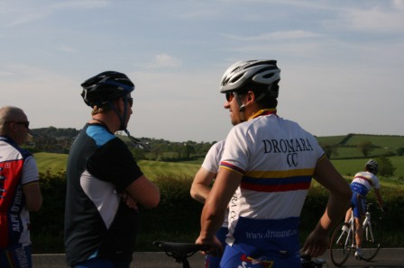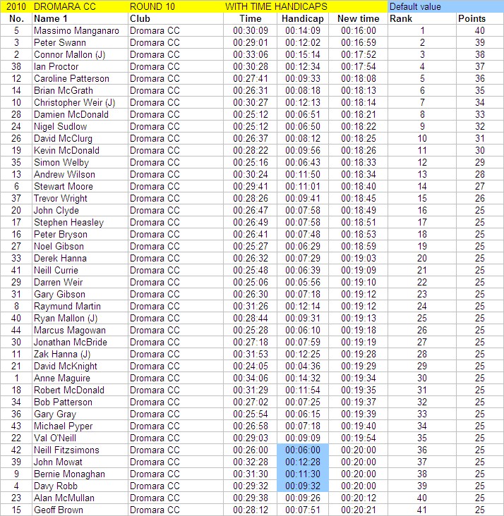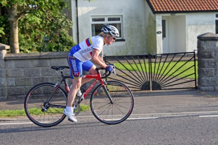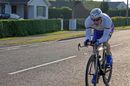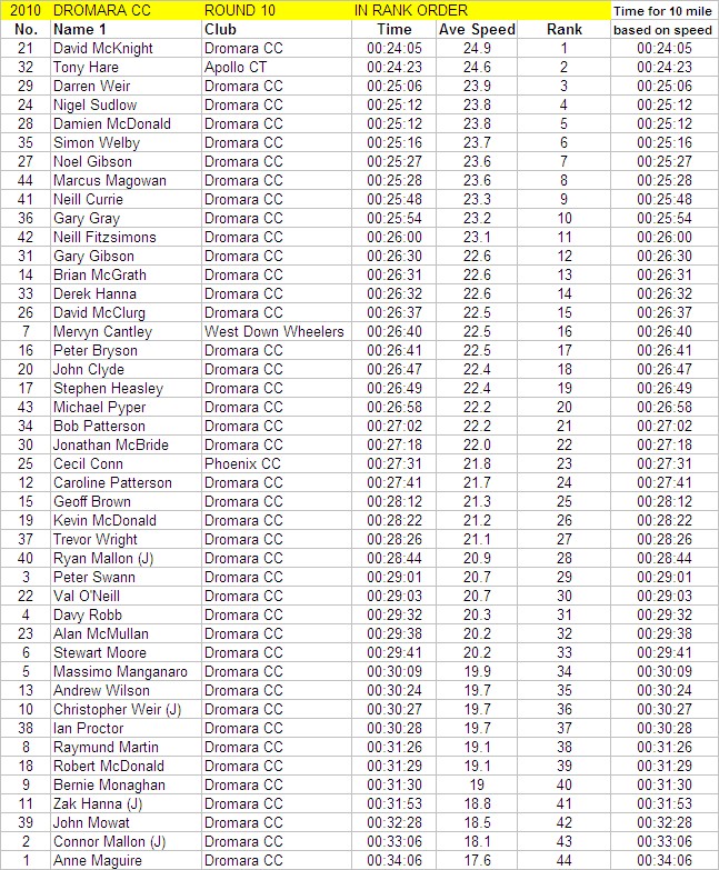 League - Round 10 10 mile individual time trial - Downpatrick Road, Ballynahinch (map) 03 June 2010 Round 10 of Dromara Cycling Club's Thursday night league took place on the Downpatrick Road just outside Ballynahinch. The road is quite busy with little room for cars to park and the club wish to thank the management at the Millbrook Lodge for the use of their car park. Forty four riders gathered, among them three guests from other clubs, to complete the ten mile time trial. It was a fine summer's evening with only a slight breeze which the riders experienced further out the road. First away was Anne Maguire, who was one of four women taking part, with the rest of the riders following at 30 seconds intervals. Fastest on the night was David McKnight who set a time of 24 minutes, and 5 seconds. Next fastest was guest Tony Hare (Apollo CT), who set a time of 24m 23s, with Darren Weir finishing in 25m 06s. Nigel Sudlow and Damien McDonald both set a time of 25m 12s with Simon Welby only 4 seconds slower. The fastest of the women was Caroline Patterson who set a time of 27m 41s with Val O'Neill second (29m 03s). Fastest youth rider was Ryan Mallon who finished in 28m 44s with Christopher Weir finishing in 30m 27s. With regards to league points the times above are compared to the average set by the riders this season. Those who improve upon their average times get more points than those who do not. Winner of the 40 points this week was Massimo Manganaro, who was out on his new bike, and managed to knock 4 minutes off his average time. Next improver was Peter Swann who was 3 minutes quicker than his average time, and Connor Mallon, one of the youth riders, went just over 2 minutes faster than his average. Ian Proctor also had a good event when he went 2 minutes 6 seconds faster than his average. Time handicapped times below (->) Many thanks to timekeepers Trevor Annett and Stephen Wallace and to all the marshals for keeping the riders safe. The next round is a 10 mile time trial starting from Spa Lake on Thursday 10 June 2010 starting at 6:50 pm. Timekeepers: Trevor Annett and Stephen Wallace Marshall: Gavin Magowan, Chris Magowan, Ronnie Smyth Photographs: Gavin Magowan Report & photographs: Martin Grimley | Photos by Gavin![]() ![]() ![]() |