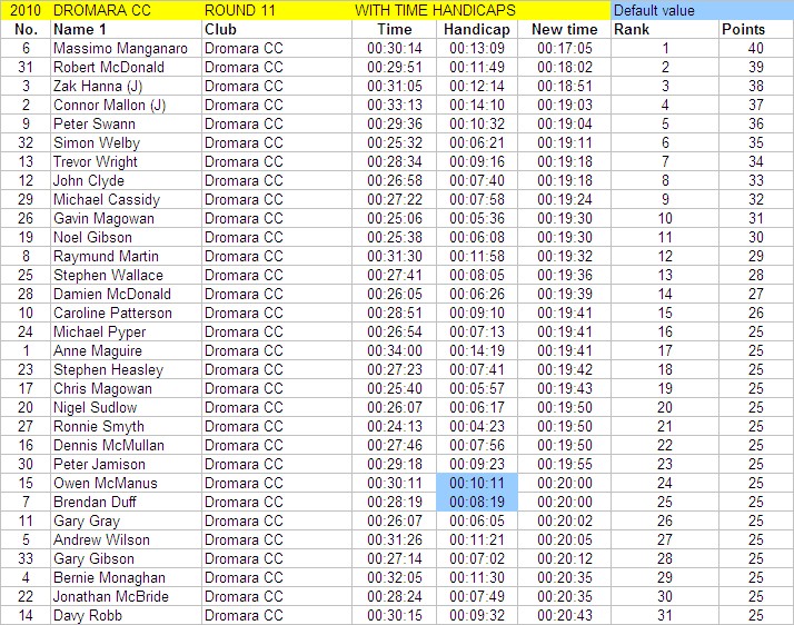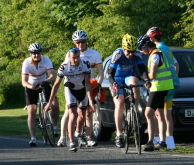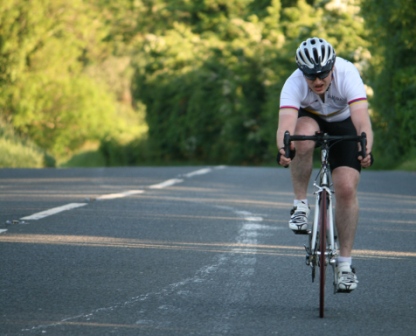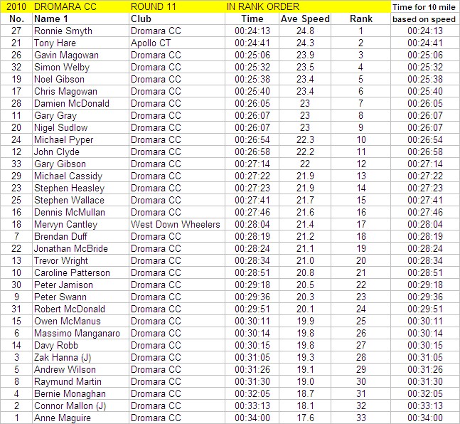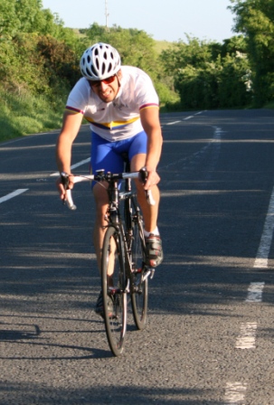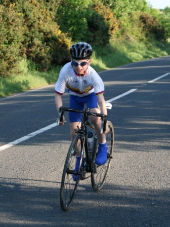 League - Round 11 10 mile individual time trial - Spa (map) 10 June 2010 It was a beautiful summer's evening, perfect for another cycling event in Dromara Cycling Club's busy calendar, this time with a 10 mile time trial on the Dunmore Road starting at Spa Lake. Thirty-three riders showed up to take part in this event, a reduced number as some of the riders were 'saving themselves' for the club's open road race on Saturday. First away was Anne Maguire setting off the 5 mile distance to Seaforde before turning and heading back to Spa Lake. Thirty seconds behind Anne were the junior riders Connor Mallon and Zak Hanna both separated by the thirty second interval. Canadian born Brendan Duff came along to try out our time trials, but Brendan is no stranger to competitive cycling as he had competed at a high level back in his youth. Among the Dromara members were two guests from other clubs, Tony Hare and Mervyn Cantley. Quickest on the night was veteran rider Ronnie Smyth, who had a great weekend of racing in Donegal competing in the Rás Dun na nGall, 16th on the final stage, 15th in the overall general classification, 3rd vet and second in the team general classification! Next quickest was guest Tony Hare (Apollo CT), who was just less than 30 seconds slower than Ronnie and finished in a time of 24 minutes and 41 seconds. Third fastest was our own Gavin Magowan in a time of 25m 6s, fourth was Simon Welby in a time of 25m 32s with Noel Gibson just 6 seconds slower. Caroline Patterson was the fastest of the three women finishing in 28m 51s. Comparing the times set tonight against the average times set this season, the league awards points for those who perform 'better than average'. Taking this into account, the rider with the biggest time increase over his average (almost 3 minutes) was Massimo Manganaro, who has now had a hat trick of maximum points in time trials. Next, with the greatest improvement, was Robert McDonald who finished almost 2 minutes faster than his average. The junior riders also performed well tonight with Zak Hanna improving by over a minute and Connor Mallon improving by just less than one minute. Peter Swann has only been out with the club three times this year and managed to finish almost a minute faster than his average time. Time handicapped times below (->) Many thanks to timekeepers Derek and Brian and to all the marshals Alan and Brian for keeping the riders safe. The next round is a road race on the Drumaroad circuit on Thursday 17 June 2010 starting at 6:50 pm. Timekeepers: Derek Hanna and Brian McGrath Marshall: Alan McMullan and Brian Steele Report & photographs: Martin Grimley |