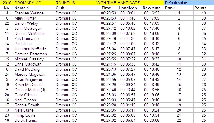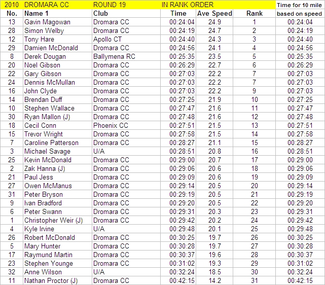 League - Round 18 10 mile time trial, Annahilt circuit (map) 29 July 2010 Round 18 of Dromara Cycling Club's Thursday night league took place at the much favoured Annahilt circuit. This circuit has only just been introduced this year as a time trial circuit and as before the start took place at the bottom of the Ballycreen road. The riders had to travel along the Ballycreen Road/Ballykeel Road, turn left onto the Glebe Road, then left onto the Ballynahinch Road straight into Ballynahinch before turning left up the Magheraknock Road to the finish. There were 24 riders competing tonight with one guest, two youth, and three women including Anne Wilson who tried our road race at Annahilt last year. First away was Zak Hanna who was followed 30 seconds later by Anne. The first 11 riders had 30 second gaps and the remaining had one minute gaps. Last rider away was Marcus Magowan. It was a clear evening with little wind and it was not long before the riders started arriving at the Magheraknock Road. First back was Gavin Magowan who finished just 3 seconds inside of 24 minutes. The fastest rider on the night was expected to be Ronnie Smith but he was beaten by over 30 seconds by Simon Welby who surprised himself at how well he had ridden (22m 57s). Third and fourth fastest were brothers Gavin and Chris Magowan with Gavin just 19 seconds faster than Chris tonight. It was another Magowan, Marcus (not related), who finished fourth fastest in a time of 24m 35s. Fastest women tonight was Caroline Patterson and fastest youth rider was Zak Hanna. Comparing tonight's time to the average times set by the individuals over the same distance and it was clear that almost all riders had improved on their average but it was Stephen Younge who had the biggest difference and he took maximum points (40) for this round. Mary Hunter had the second largest difference in average times and Simon Welby was third. Many thanks to the timekeeper and all the marshals. Round 19 is next Thursday (5 August 2010) and will be a 10 mile time trial at Spa starting at 6:50 pm. Timekeeper: Trevor Annett & Andrew Wilson Marshals: Tony Mallon, Damien & Robert McDonald, Davy McKnight, Davy Robb, Jim McMaster, Neil Fitzsimons and Stephen Wallace. Report & photographs: Martin Grimley |
