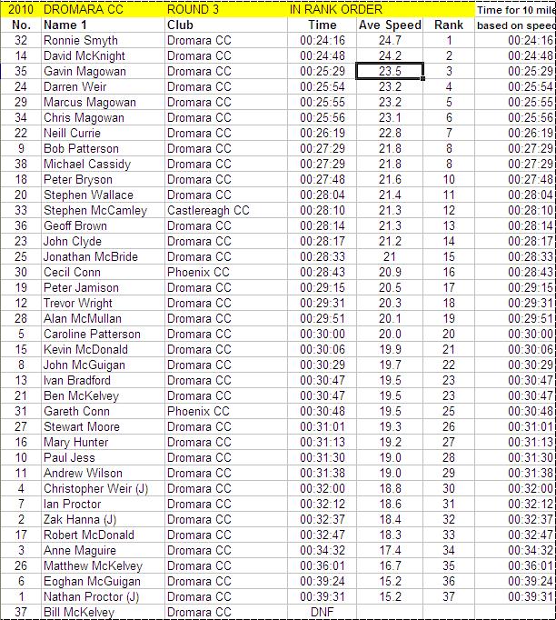 League - Round 3 10 mile individual time trial - Dundrum Road, Dromara (map) 15 April 2010 Thursday 15 April 2010 saw the first of the 10 mile individual time trials held on the Dundrum Road just outside the village of Dromara as part of Dromara Cycling Club's League which runs from April to September each year. A large collection of riders had turned up on this bright dry spring evening including many of the riders who had just returned the day before from a week's cycling in Mallorca. Some of them were quite tired after a tough week in the saddle and had chosen to marshal the event instead. Among the club members were three guest riders from other clubs and the McKelvey family who are running a charity cycle on Sunday around Strangford Lough (see website here for more details). Trevor and Martin were busy getting the 38 keen riders signed on and ordered so that Davy Robb could get them set off around 7:10 pm with just 30 seconds interval between each rider. This round was the first of 10 events which counted towards the club's Womens and Youth League. First away were the junior riders, Nathan Proctor, Zak Hanna, Christopher Weir and Eoghan McGuigan and two of the female riders Anne Maguire and Caroline Patterson. Fastest of the evening was Ronnie Smyth with a time of 24m 16s with Davy McKnight second 24m 48s, Gavin Magowan third 25m 29s and Darren Weir fourth 25m 54s. It was great to see Marcus Magowan back on the bike after a nasty fall back in February when he broke his jaw and wrist. Marcus was only one second slower than Darren and Chris Magowan was just one second slower than Marcus. Neill Currie was 7th with a time of 26m 19s and behind him setting a great time was Bob Patterson 27m 29s who finished with the same time as Michael Cassidy who also had a great ride. Peter Bryson was 10th fastest with a time of 27m 48s. Looking further down the list we had Geoff Brown, more accostumed to being on a mountain bike, setting a great time of 28m 14s which gives some indication of why he does so well at the trail quests. Newcomers John Clyde and Trevor Wright both finished inside the magic 30 minute time. The fastest female rider was Caroline Patterson who completed the tough 10 mile circuit in exactly 30 minutes with Mary Hunter not far behind on 31m 13s. Full results below. Many thanks to timekeepers Trevor Annett and Davy Robb and to all the marshals for keeping the riders safe. The next round is another 10 mile individual time trial which will take place on Thursday 22 April 2010 on the Lurgan Road in Dromore starting at 6:50 pm. Timekeepers: Trevor Annett & Davy Robb Marshall: Brian McGrath, Damien McDonald, Derek Hanna, Gary Gibson, Neil Fitzsimons, Nigel Sudlow, Noel Gibson, Ryan Mallon. Report & photographs: Martin Grimley | ![]() ![]() ![]() |