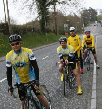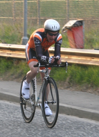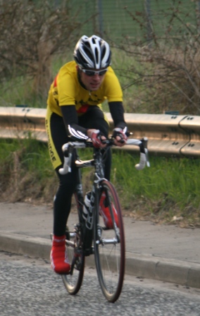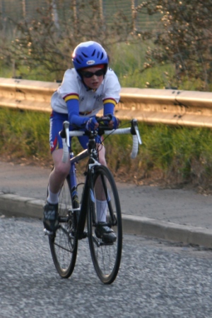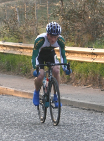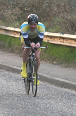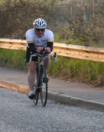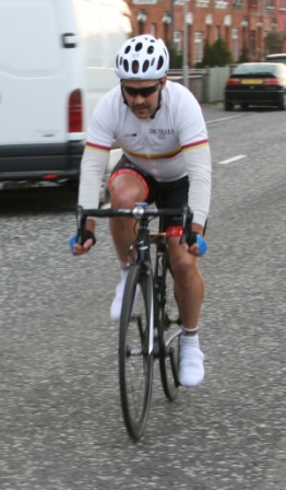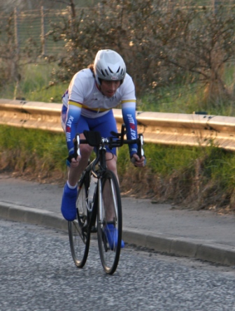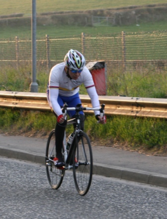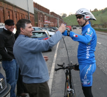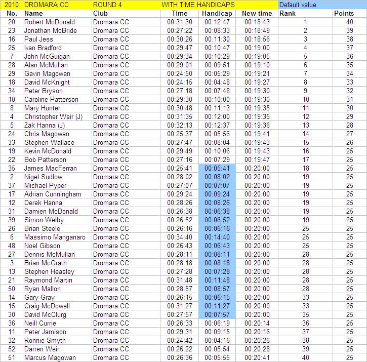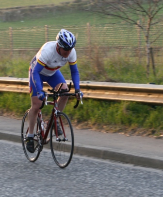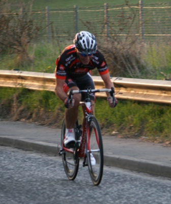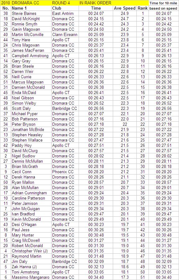 League - Round 4 10 mile individual time trial - Lurgan Road, Dromore (map) 22 April 2010 Round 4 of Dromara Cycling Club's Thursday night league was held at the Lurgan Road in Dromore County Down and it attracted a large field of 52 riders including 11 guests from other clubs. It was a perfect night for cycling , dry with little wind and some outbreaks of sun. Trevor and Martin were again kept busy getting all the competitors for this 10 mile time trial signed on and then listed into a start order. First away just after 7pm was Toni Armstrong (Apollo CT), daughter of Campbell Armstrong who was also competing. Club race secretary Nigel Sudlow was next off but was not expecting a quick time as he was not feeling the best. Brian McGrath followed 30 seconds later followed by some of the youth riders, Christopher Weir and Zak Hanna. Massimo Manganaro was next followed by John McGuigan then Mary Hunter who had just completed a time trial the night before as part of the Ulster Women's Assocation Time Trials. The rest of the riders followed at 30 seconds intervals without a hitch, apart from Stephen Heasley having to get slotted back into the order after missing his 'slot time', until Gary Gibson's turn at 24½ minutes into proceedings. Gary was being held in the saddle by Ross Galway until the time keeper said 'Go' then Gary pressed firmly down on pedals and snap went his chain. He had barely went 6 feet ! The remaining four riders had no such problems. Last away was the late arrival, Darren Weir, who had just managed to lay a concrete floor before rushing to get to the time trial. This preparation did not help his time as he was well off the pace tonight. Fastest on the night was guest Stevie Baines (East Antrim) who finished this tough circuit in a time of 24 minutes and 7 seconds which was 8 seconds faster than David McKnight with Ronnie Smyth third. Fourth was Gavin Magowan who finished in under 25 minutes, with guests Martin McConville (Clann Eireann), Tony Hare (Apollo CT) 5th and 6th respectively. Ryan Mallon was the fastest junior finishing just under 29 minutes with fastest women Caroline Patterson finishing in 29 minutes 30 seconds. Full results below. Many thanks to timekeepers Trevor Annett and Davy Robb and to all the marshals for keeping the riders safe. The next round is a road race on Thursday 29 April 2010 starting at 6:50 pm, location to be confirmed. Timekeepers: Trevor Annett & Davy Robb Marshall: Bernie Monaghan, Ross Galway, Tony Mallon Report & photographs: Martin Grimley | Lots of visitors Gary didn't get too far, 6 feet !! Spectators |