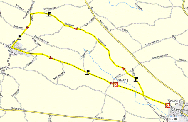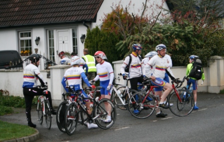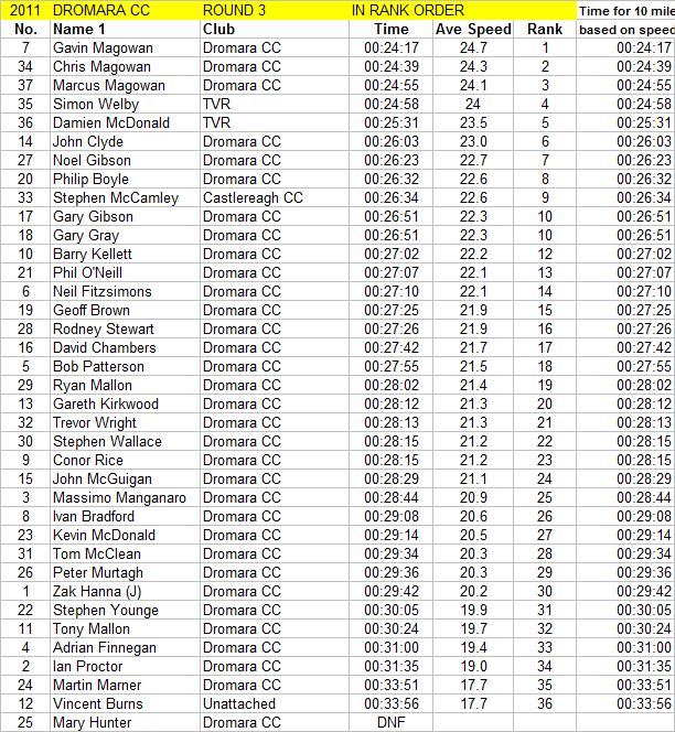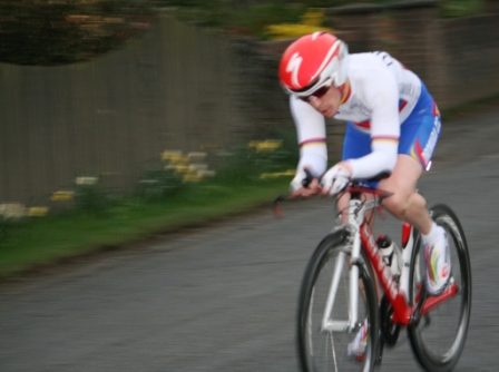 League - Round 3 10 mile time trial, Annahilt Circuit (map) 14 April 2011 A dark, damp evening greeted the cyclists for Dromara Cycling Club's Thursday night league which was a 10 mile time trial around the Annahilt triangle. The circuit was changed from last year as the nearby Pinewick furniture was having a closing down sale and the traffic around the showroom would have made it dangerous for time trialists to be finishing among. Sign on took place at the usual spot on the Riverside Road and, despite the damp conditions, 37 riders took part among them were three guests from other clubs and one unattached rider. The start was further up the Lisburn Road near the Laurel Road junction with riders lined up tight to the kerb to keep out of the way of the busy traffic. First rider away was youth Zak Hanna around 6:55 pm. Riders were let off at 30 seconds intervals and had to race down towards the junction, take left onto Ballycreen Road, Ballycreen Road turns into the Ballykeel Road which joins up to the Glebe Road for another left hand turn. At the end of Glebe Road the riders turn left again and head straight for Ballynahinch where the finish was just outside the urbanisation. Gavin Magowan was 7th away but the first one back and was the fastest on the night setting a time of 24 minutes and 17 seconds on a very undulating course. Brother Chris was second fastest just 22 seconds slower with another Magowan, Marcus, taking third place just 16 seconds behind Chris. Simon Welby (TVR) was the only other rider to finish under 25 seconds with team mate Damien McDonald completing the distance in 25m 31s. John Clyde set another good time, 26m 03s, 20 seconds ahead of Noel Gibson with Philip Boyle just 9 seconds slower. Guest Stephen McCamley (Castlereagh CC) was 9th just ahead of joint 10th place, both named Gary, Gary Gray and Gary Gibson on 26m 51s. Mary Hunter was the only woman to compete but pulled out half way around. Young ZakHanna finished in 29m 32s. Many thanks to the timekeepers and all the marshals. Round 4 is next Thursday (21 April 2011) and will be an individual 10 mile time trial on the Crossgar Road out of Ballynahinch. Sign on from 6:15 pm - first away at 6:30 pm. Timekeeper: Nigel Sudlow & Philip Wilson Marshals: Brendan Monaghan, David Robb, Dennis McMullan, Paul Jess, Robert McDonald, Ronnie Smyth, Bobby Archer, Raymund Martin Report & photographs: Martin Grimley |