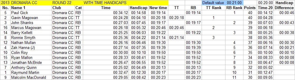 League - Round 22 10 mile TT - Crossgar Road, Ballynahinch (map) 29 August 2013 The final 10 mile time trial of the season took place on the Crossgar Road heading out of Ballynahinch. This is a tough twisting circuit and not one of the favourites among the testers. However, this evening was perfect for the event with dry conditions and a favourable wind which saw a new course record set by Gavin Magowan of 24 minutes and 28 seconds. Eighteen riders turned up to take part, 16 from the club and 2 guests. Riders got underway at 7pm sharp with Paul Gick heading off first with the rest heading off at 30 second intervals. The fastest riders on unmodified road bikes were Anthony Quinn and Barry Kellett who both finished ahead of the second fastest rider on a time trial specific bike, Ronnie Smyth. Nathan Mullan also set a great time on his road bike beating Marcus Magowan on his time trial bike. Well done to all the riders. Many thanks to the time keepers and marshals. Timekeepers: Lisa Millar and Marty McAnulty Marshals : Gary Gibson, Gary Bailie and Richard Cowan Report: Martin Grimley Photos by Richard Cowan: here |