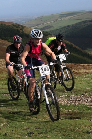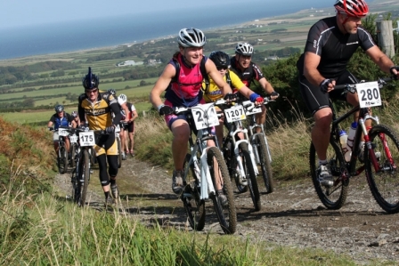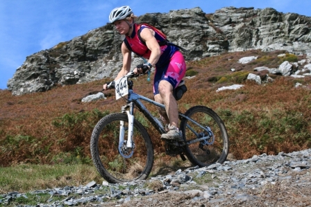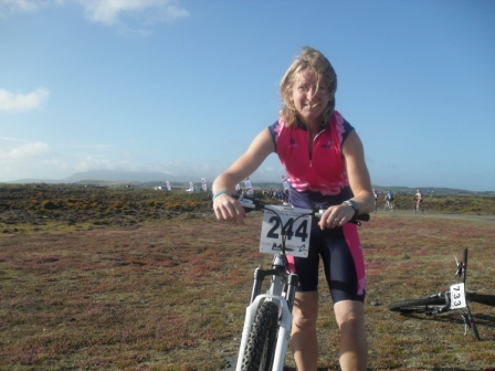 | 12 September 2010 The Manx End2End MTB Marathon Challenge took place on Sunday in challenging conditions, with Andrea ranking very highly in her first event of this type. Husband Paddy also finished well, happy to have finished at all given he had a broken front brake lever! Despite the blue sky and sunshine, conditions were very challenging with strong winds and extremely heavy and slippery ground after the preceding days of wet weather. This made an already gruelling event - full of beastly climbs, rocky descents, and any relatively flat ground being marshy - all the more brutal. The race had a record number of 1,359 riders on the starting list, and ended with a record finishing total of 1,002 competitors. The attrition rate is high, which is reflective of the ruthlessness of this event. There is no let up in intensity from the very start of the End2End, with the potential for carnage extremely high given it's a mass start in a very narrow track at the Point of Ayre, the very north end of the Isle of Man. Wheel nudges are to be expected, as is the odd elbow, but these also occur on and off for the duration of the race too! Riders and bikes were transported from Douglas, by bus and lorry, to the starting point. Andrea's bus was one of the last to get there, and so the challenge began……trying to battle from the back of the mass of eager riders, through a few hundred people, to get even a midway starting place! Testosterone was flying and many male competitors clearly felt that females should have no place in the front half of the massive pack! Apart that is from Paddy, who was quite happy to start from the back and quite happy to send Andrea as far forward as she could get! By the time there was 2 minutes to go until the starting hooter, Andrea had worked her way up from the back to probably 600 people from the front. Ah well, at least it meant she could pick people off on the road section! The 75 km route to the Calf Sound at the southern tip of the Isle of Man begins with a 20 km road section before 55 km of beastly off-road and mountains. Andrea decided to hammer the first 20 km, which in the first few km involved much more argy bargy than the starting area given the number of people cycling on a narrow road. From the start she found much amusement in guys struggling with the idea of a girl overtaking them. The End2End was Andrea's debut extreme MTB race, and she quickly began to think there is much more testosterone flying about amongst MTBers than amongst road bikers, adventure racers or triathletes. The Ding Dong shorts also attracted much less attention in this hardcore MTB event than in other events. One guy shouted the slogan out as Andrea passed him just 1 km into the race – and then shouted Ding Dong and cheered her on in the finishing straight a few hours later. There was one other instance of it being said, but that was it. Rather than focus on the Ding Dong, much of the attention in the road section appeared to be on guys trying to retake the lead from Andrea once she passed them. But more often than not they relinquished the lead again, as Andrea kept a constant pace, and they realised that she was riding at a high speed that she could sustain for the entire 20 km. Paddy on the other hand went for the 'let everyone pass you on the road and then get them in the long grass' approach! But then with a brake held together by 'duct tape' and a broken spoke in the rear wheel, finishing became the sole objective. All the time wondering how his wife was getting on and how his son, Young Gun Fraser, was doing at Tollymore. On one occasion an irate male competitor shouted after Andrea, "You're riding that bike like you stole it" – little did he know how appropriate the comment was given Andrea's house unfortunately had unwelcome "visitors" over the weekend! Andrea overtook a couple of hundred riders in the 20 km road section, but even with this she still hit bottlenecks early in the offroad, uphill sections and every so often had to stop cycling and hike-a-bike. Just as well she has had a lot of practice at this in the past few months! The first part of the offroad section climbed the mountains in the north of the island, which may well boast stunning views across the Irish Sea to Ireland, but can not truly be taken in when you're going at an intensity that requires focus on the terrain just a few metres ahead of your front tyre! The whole route is a relentless course of long uphills and tricky downhills. There is little chat or banter amongst competitors, in the front end of the field that Andrea was in anyway, because such a high level of concentration is required to just keep moving. The choice of path along some of the rutted and wet sections was vital as was shown by one rider who, in trying to overtake Paddy, ended up quite literally swimming in a large puddle … and no, Paddy did not push him! One of the long uphills in the second half of the course brought Andrea her only banter of the race. Shortly after going over the top of a punishing and lengthy ascent, a male racer passed Andrea and said, "you have got to be the strongest girl I know. I was going to say the strongest girl that I don't know, but I feel I should know you given that I've spent the last 15 minutes being pulled up that climb staring at your Ding Dong"! The gruelling nature of the start of the second half of the course is clear when you see your bike computer take 57 minutes to move from 43 km to 52 km. Demoralising! On numerous occasions throughout the day Andrea felt like a hamster on a wheel. There you are, grinding away, putting in 110% effort constantly and working in excess of 85% of your maximum heart rate….and you are barely moving! On the most challenging climbs Andrea's average speed was only 5km per hour. Oh how often she thought to herself that on a smooth surface and road bike, on a similar gradient, the reading would be at least three times that! Then every so often you think great,