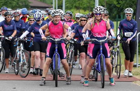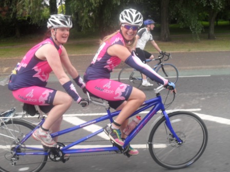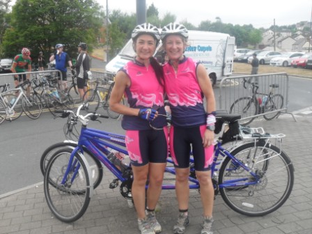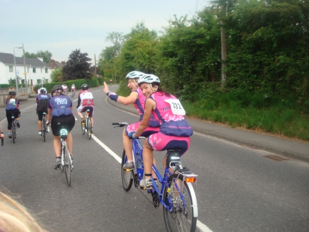 | 26-27 June 2010 Maracycle 2010 – Ding Dong Of A Weekend ! The Belles and their band of merry "Monthly" cyclists are back safe and sound from the Maracycle, many with very sore backsides, aching legs and a few bruises….but all with massive smiles on their faces! Well done everybody. A tough weekend of pedalling, way surpassing anything that any of the "Monthlies" have ever done before – but as expected they all did it in style! And not just because of the new jerseys! The girls met at 6:45am on Saturday at the PEC in Belfast, apart from 3 of the 4 Belles who in true form held up the lastminute.com nature of the Belles! But hey, a 7:10am arrival wasn't too bad – giving us ample time before our planned 7:30am start to tear off the labels from 2 brand new tandems and try to get the bikes set-up right for the 107 miles to Dublin! Having made sure all the other girls had top tips about nutrition, and to use tried and tested kit (by no means anything new!) – the Belles blatantly ignored their own advice and sat on tandems, which had only been delivered, for the first time together just 5 minutes before they started. All the girls were nervous pre-departure, about to embark on an endurance event that they had never come close to before. The Maracycle involves biking from Belfast to Dublin, 107 miles on Saturday, then either getting the train back up on Sunday or biking back the same route to Belfast. Despite the nerves there was also a clear level of excitement and everybody was up for the challenge. We started at 8 am and soon set into our own rhythms, sporadically disrupted by dodgy gear changes on the tandem and high-pitched whooping and giggling. Being unaccustomed to tandems did not interfere with Belle Julie's photo taking on the move, just 100 metres into the cycle!, and Taryn soon found out that on the back of the tandem she could keep pushing hard with their legs but be hands-free…..which was fantastic for checking emails and updating Facebook! Not to mention flashing her Dromara C.C. cycle gloves! All girls pedalled at a good pace for the first 27 miles to Banbridge, where there was a refreshment stop and everybody managed to hook up as the first of the pack were just starting off again when the last of the pack arrived. Everybody was having great fun and enjoying the experience. Being worried about having ample food, the girls filled up their pockets – Jenny looking like a pack horse and stretching her pockets to the limit! Elaine didn't want to carry too much however, because she was already rueing her heavy bike and wanting a road bike. Elaine, we know a very reputable bike shop! The next refreshment stop was Camlough at 45 miles, where again everybody caught up with each other, before setting out at their own pace to the lunch stop in Castlebellingham at 69 miles. By this stage the Belles and the Monthlies were well known amongst all participants, with friendly comments being shouted as the girls passed other riders – and the words "Ding Dong" regularly being shouted at all the girls. One cyclist, on a long drag of a hill, even highlighted that "looking at your ding dong got me up that hill" and another said that "the high point was frantically pedalling to catch up with the Belles, then tucking in behind and getting the best view of the day". What a lie! The views along the Maracycle route were stunning, and we hope more lumpy and bumpy than our rear ends! Maybe not as bumpy as Belle Cathy's tummy, who at 25 weeks pregnant was not finding the tandem the most comfortable. But given our attention to detail and Maracycle specific preparation (?!), we had our own personal Midwife Jen as part of the group, as well as Anaesthetist Catherine! We were hoping however that an epidural would not be necessary – for Cathy or for those that wanted to be free of leg pain because of the cycle! By the lunch stop the girls had become well spread out, and only a few managed to catch up with each other over a limp sandwich and a few packets of biscuits! But we knew that everybody was safe and sound and knew that all the girls would reach their goal of arriving in Dublin. After the lunch stop it was just less than 40 miles to the finish, but this was in fact the most challenging and slowest part of the day that included a 10 mile section of 4-5 tough climbs with a strong headwind and blazing sunshine. Not to mention two beasts of tandems which require excessive heaving and grunting! However we would not be beaten, brute force and ignorance (which we're clearly very good at!) prevented us from having to walk. Having started at 8am, the leader of the girls' pack reached the finish line just after 5pm, with the last of the girls arriving at 730pm. The official finish was 2.5 miles from the actual event headquarters and accommodation – so a nice wee police escorted warm down to finish the day. Although some backsides begged to differ! All the girls were on a high, chuffed with what they had done, although those scheduled to bike back to Belfast on Sunday were a bit scared at the prospect. Event headquarters was the impressive DCU (Dublin City University). Bikes ditched (tandems into a lorry because the Belles were cycling their road bikes home on Sunday!), bags picked up, rooms got….ahhhhhhhhhhhhhh showers! Even bigger ahhhhhhhhhhhhh delicious dinner in the canteen. A great variety of food, all extremely tasty…and lots of it! All that remained for a good night's sleep was alcohol and a bit of pampering, which some took to much greater lengths than others! Sunday morning, and only 107 miles until home! Half of the girls had opted to cycle back, with the other half catching the train up. Most of the returning cyclists met for breakfast at 7:45am, although some went for an early start convinced that they would need every hour of daylight to make it home and beat the sweeper vehicle. About 8 of us got underway at 8:30am, with one of the Monthlies taking a nasty spill at the first spe