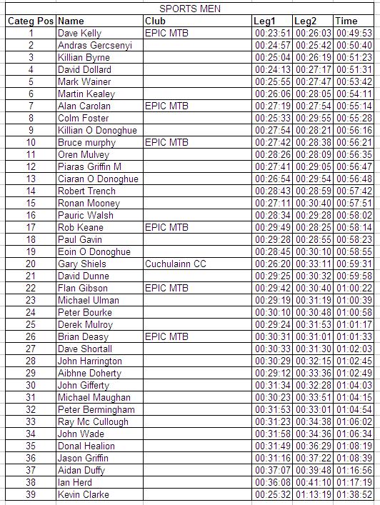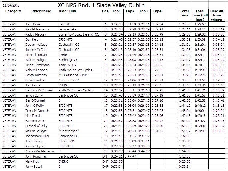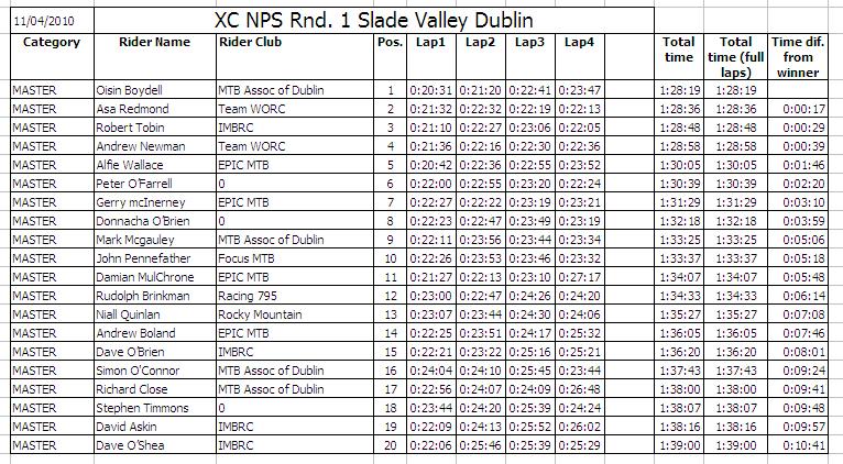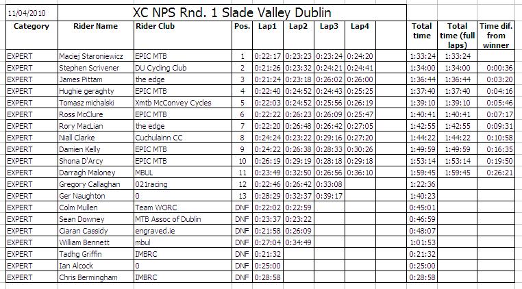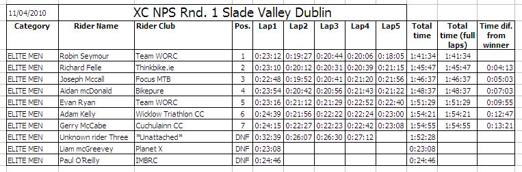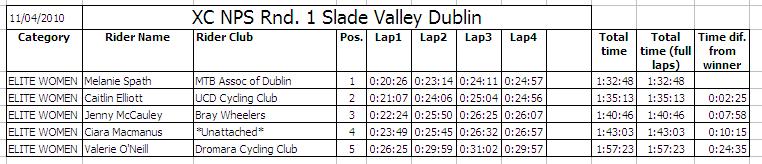 | Sunday 11 April 2010 Slade Valley, Co. Wicklow The sun shone for the first round of the 2010 Irish National Points Series of mountain bike racing which took place in Slade Valley, Saggart, Co. Dublin. The host club was IMBRC and they had carried out an enormous amount of work on the circuit including building bridges and laying down gravel. The dry weather in the lead up to the race had greatly helped the rideability of the course which still proved challenging for all riders. Parking was provided in a field just outside the main wooded area which proved perfect for picnics for the spectators while the racing was going on. Given the weather there was a large turn out for the event which put a lot of pressure on the staff manning the sign on tent and lead to some long queues. As an encouragement to attract youth into off-road racing the organisers had made it free entry for all youth races. The youth races had been advertised as starting at 11:30 however the organisers had made a last minute decision to start these races early which caught out some parents. The race start was up a long fireroad some distance from the sign on area. There were races for the Under 8s, Under 10s, Under 12s and Under 14s which incorporated different course designs for the various age groups. The youth races were all but over by 11:30. In the 3 lap Under 8s race there was a great representation of riders from Ulster with the dominant Banbridge Cycling Club taking the top 2 spots with Jack Baird and Christopher Curry respectively. Third was Caoimhe May who was followed by Shea O'Kane (Phoenix CC). The Under 10s race had 3 laps of a slightly longer circuit and it was another Banbridge rider, Mark Buller, who took the win ahead of Craig McCarthy (Castlereagh CC) with Cian May third and Kristof Rael in fourth. There were just five riders in the Under 12s race who had to complete 4 laps of the same course as the Under 10s. This was another category dominated by Banbridge Riders with John Buller taking the top spot, Richard Baird taking second and Shannon Buller taking fourth. The other two riders were Jamie Kavanagh who was third and Allesandro Martins who came fifth. There were five riders in the Under 14s race and this time it an EPIC mtb rider, Cian Mulligan who took the win ahead of James Curry (Banbridge CC) and Conor Lavelle (MAD mtb). Joseph Baird (Banbridge CC) was fourth with Conor Kavanagh fifth. The next set of races started at 12 midday and these were for the main course which was approximately 5 kilometres long. The course had a long fireroad start which went into the forest through a large section of tree roots. From the bright sunlight on the fireroads to the darkness in the forest and the technical terrain, there were quite a few tumbles especially for those who had not raced in this location before. The course was tough with two single track climbs and only a few brief respites onto fire roads. The Under 16s, Sports Men and Sports Women were all called together to the start line by race organiser Richie Bryne. There was over 50 lined up and all had to do two laps of the course. All adult riders had been given a 'chip' to wear around their ankles as part of the "chipit" timing system. The categories were not set off separately rather there was only one whistle for all 50 to start together which inevitably lead to some 'traffic' at the entrance to the forest. Four out of seven Under 16s were from XMTB McConvey Cycles and they secured the first four positions with Kyle McEwan taking first ahead of club mate Stuart Ballantine with Claire Oakley third and Martin McGauley fourth. For the Sports Women's race there were 6 riders with the fastest Agata Tamulewicz (MAD mtb) finishing first, in just less than one hour. Rose Griffin was second with Gillian Ryan third. The main field was made up of over 50 Sports Men and was won by Dave Kelly, EPIC mtb, with Andras Gercsenyi second and Killin Byrne third. One of the few Ulster riders in this field was Stephen Prentice who unfortunately had a problem with the timing chip and therefore lost his lap and overall times. There were quite a number of DNFs (Did Not Finish) in this category as the newcomers to the sport struggled with the technical terrain. The main races of the day started at 1:30 pm (see results sheets below). Ten Elite Men lined up for 5 laps of the main course. Wicklow man Robin Seymour (Team WORC) was on form to take the win some 4 minutes ahead of Richard Felle (Thinkbike.ie) with Joseph McCall (Focus MTB) in third, Aidan McDonald (Bikepure) in fourth and fellow Team WORC rider Evan Ryan fifth. Banbridge rider Liam McGreevy (Planet X) who was well up with the leaders after the first lap felt he wasn't on form and pulled out of the race. There were 5 women in the Elite class and they had 4 laps of the circuit to complete. Melanie Spath (MAD mtb) lead from start to finish with Caitlin Elliott (UCD) finishing second and Jenny McCauley (Bray Wheelers) was third. Ulster rider Ciara McManus, who won the NPS league last year, was fourth. Val O'Neill (Dromara CC) struggled with the tree roots and took a few tumbles but pushed on to finish fifth. Only four juniors lined up for the 4 lap event, among them was Banbridge rider Matthew Adair, who recently came second in the first round of this years Scottish XC series. Matthew took the win comfortably finishing almost 6 minutes ahead of closest rival Robert Scanlon (Team WORC) and setting the quickest lap of the day. So quick was his finish the organisers had thought he had another lap to do! Brendan Scullion (Westlakes CC) was third with Fintan Hughes (EPIC mtb) fourth. Twenty riders lined up for the Experts race, among them one women, Shona D'Ardy (EPIC mtb). They had four laps of the course to complete and only 11 of them managed to do so. In the top ten riders, five were from the club EPIC mtb including the overall winner, Maciej Staroniewicz who finished ahead of Stephen Scrivener (DU CC), with James Pit