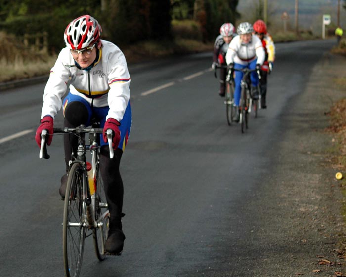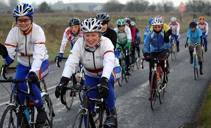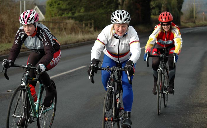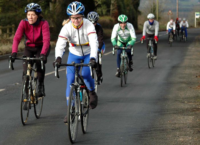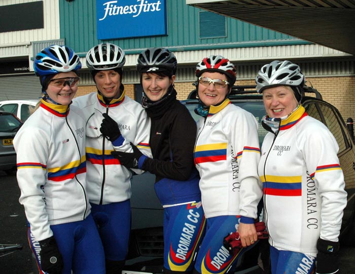 | Sunday 14 February 2010 REPORT BY BERNIE MONAGHAN Five Dromara riders turned out for the Cycling Ulster Women's Association Training Day - Ann Maguire, Val O'Neill, Sonia McLaughlin (in her Dromara shorts), Caroline Patterson and myself. There were about 25 taking part. The first part of the day was the cycle which took us through Randalstown, Ahoghill, Cullybackey and back to Ballymena. Conditions were quite good, with just a fine mist of rain at times, but otherwise nice and sunny. The roads were full or pot-holes, some really big ones, and lots of muck on the Portglenone Road, which resulted in four or five riders crashing, as far as we know, no-one badly hurt. It was a realitively flat run with just a couple of long dragging hills, one called the Tully. Then it was back to Fitness First for a spinning session, which was really great and positive, and enjoyed by everyone. really good loud upbeat music and a great instructor, Brett Thompson. After that it was showers and on to Drumsilly Hotel for a lovely lunch, which was subsidised by Cycling Ulster (If we'd known that at the start we'd have ordered fillet steaks and dessert instead of sandwiches and salads and sharing an apple crumble between 5 of us!) The day was really well organised and only cost us a few pounds each, so we all got out for a meal for Valentine's Day - we thought Tommy Lamb or Ryan Connor might have presented us all with a rose, but it was not to be!. Marian Lamb took lots of photos which will no doubt be in her report - she even came into the spinnng class to snap us all sweating, puffing and panting, she stopped just short of bringing the camera into the showers. There's a weekend for Women next weekend at Meelmore Lodge. Great day, great crack and an average of 16mph. Thanks to Ryan, Marian Tommy and all involved. FROM CAROLINE It was a great day, a good run out on the bikes 30mls and the spinning class was great craic and some singing too. Tommy Lamb joined us in the class. The food was lovely at Dunsilly Hotel especially the apple crumble with ice cream and custard which was shared between a few of us. Thanks to Louise Fullerton, Ryan Connor, Marian and Tommy Lamb. Report on Cycling Ulster here Photo by Marian Lamb, Cycling Ulster ![]() | ![]() Val, Anne, Sonia, Bernie, Caroline ![]() Photo by Marian Lamb, Cycling Ulster ![]() Photo by Marian Lamb, Cycling Ulster ![]() Photo by Marian Lamb, Cycling Ulster ![]() Photo by Marian Lamb, Cycling Ulster |