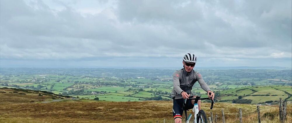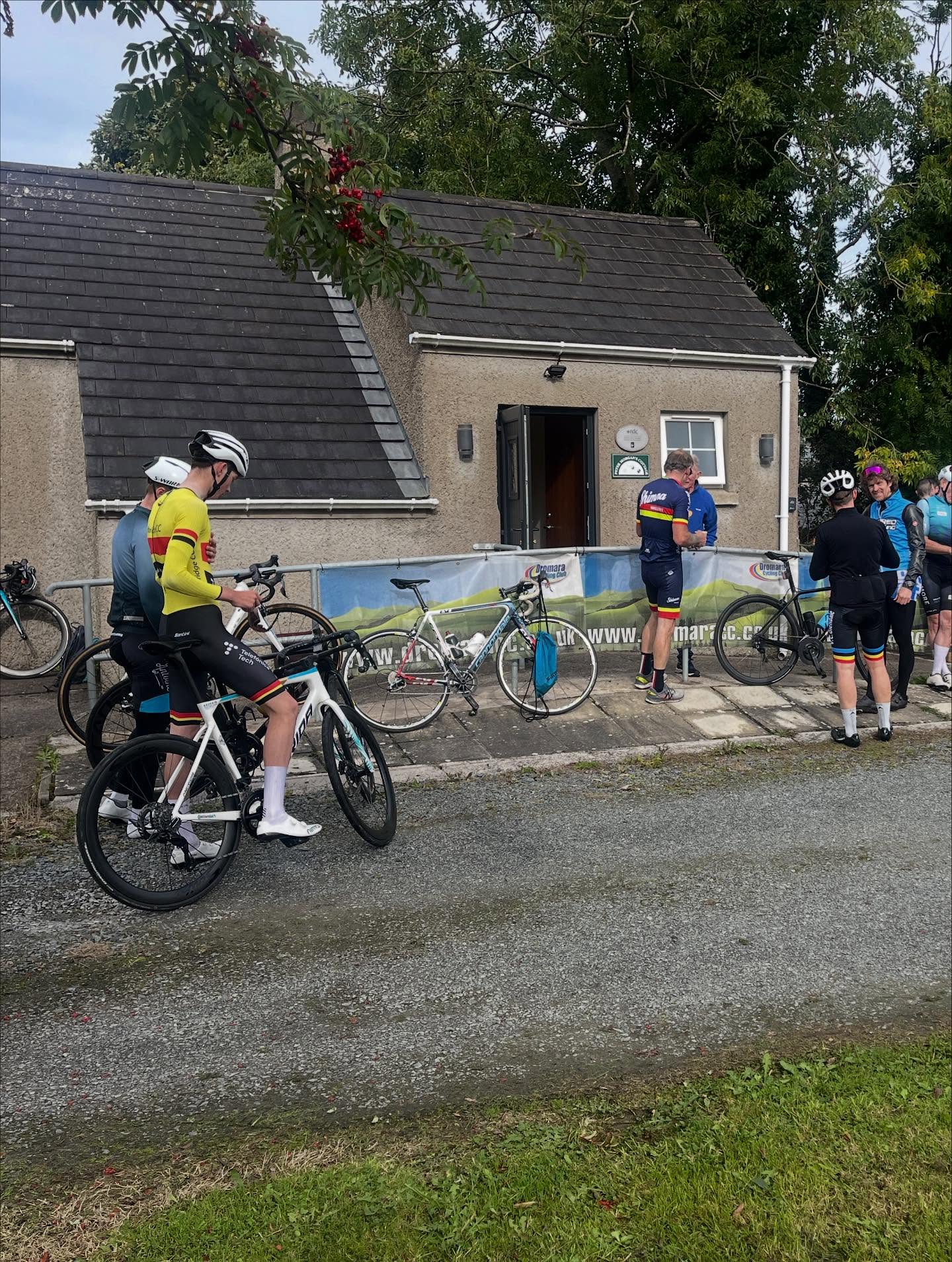 The riders were greeted to sunshine when they turned up at Peter Morgan’s cottage at the bottom of Dree Hill. From there it is a 5 kilometre cycle to the top of Slieve Croob which incorporates around 355 metres of climbing (1,167 feet). The first rider set off at 10 am. Once they got to Slieve Croob car park, the riders went through the gate and then picked a line up through the pot holes to the top of the climb where their time was taken. There were no views at the top this year as cloud had settled on the hill which also brought the temperature down. The riders wasted no time returning to the cottage for tea and biscuits.