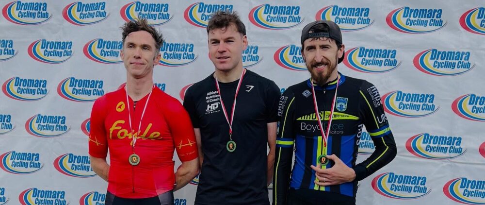 Gareth O’Neill (Athlete Nutrition Coach HD) was back to defend his Senior men’s title which he did, setting the fastest time of the day 14 minutes, 42 seconds. Conor Dooney (Foyle CC) was second with Stuart Millar (Ards CC) third and Ryan Burke (Old Bleach Cycle Club) fourth.
